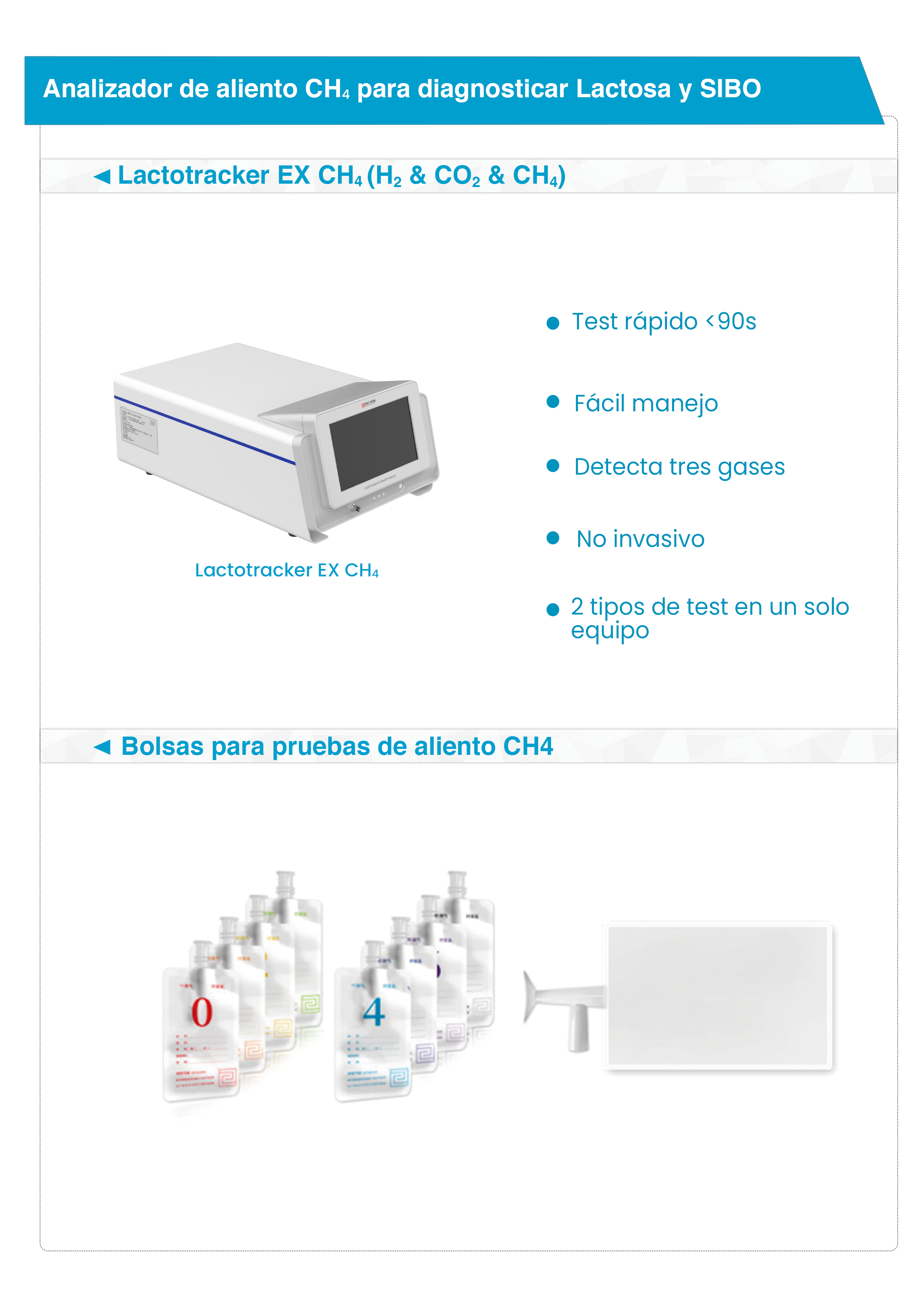 Detección avanzada de metano para diagnóstico completo de SIBO, IMO e intolerancia a lactosa.